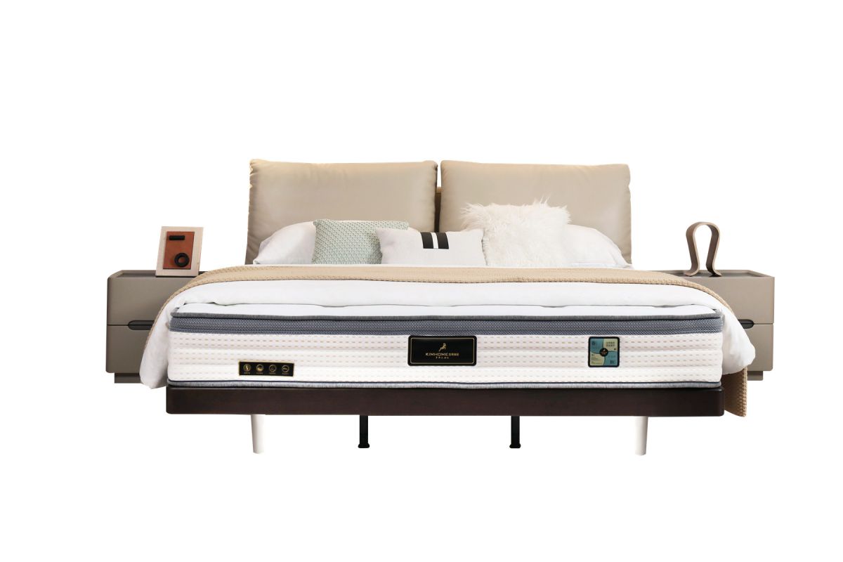 接触面头层牛皮;四边实木;床背靠包羽绒填充;床侧PU皮;全实木边框;A级