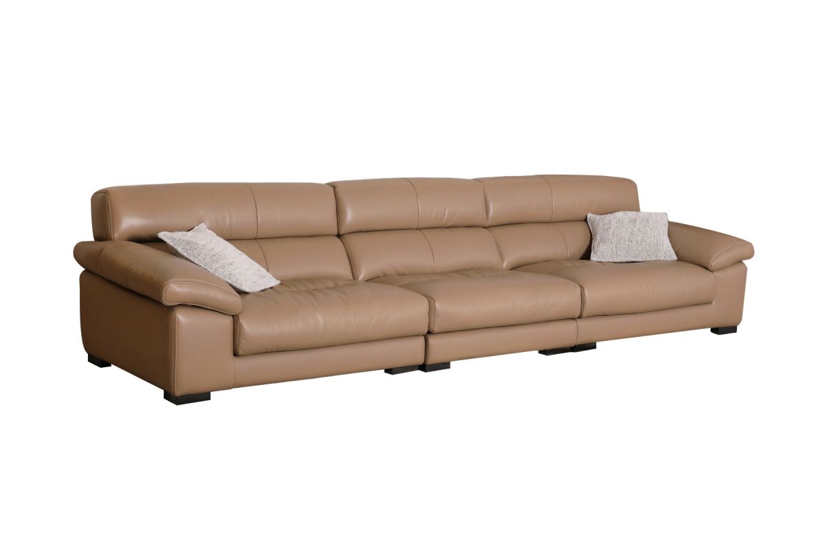 中厚摔亮头层牛皮;靠包、坐包、扶手包羽绒填充;俄罗斯进口落叶松;扶手32公分,座高42公分,扶手60公分