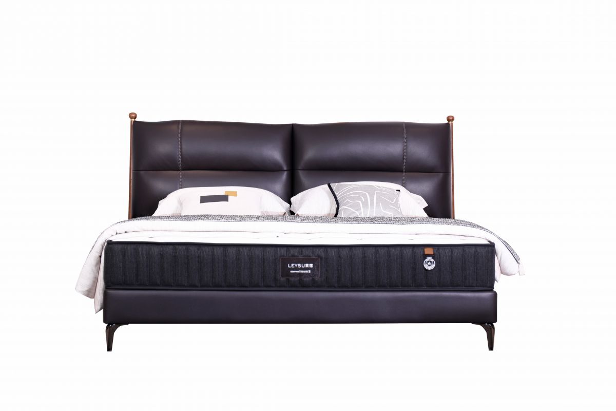 接触面头层牛皮,床头和床边,实木+实木多层板,床背靠包海绵填充,床侧PU皮,高回弹定型环保海绵 泰国进口橡