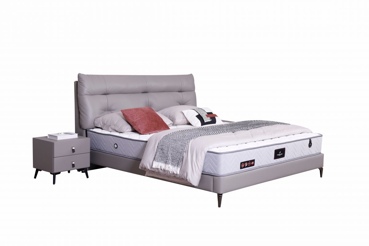 接触面头层牛皮,床头和床边,实木+实木多层板,靠包羽绒填充,床侧PU皮,高回弹定型环保海绵