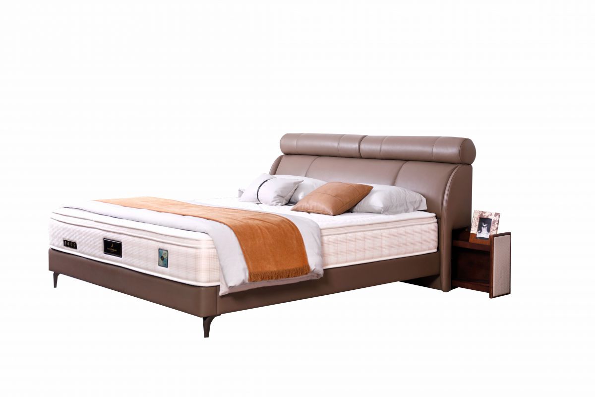 接触面头层牛皮,床头和床边,实木+实木多层板,床背靠包海绵填充,床侧PU皮,高回弹定型环保海绵 床头含床头柜