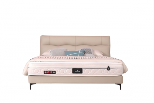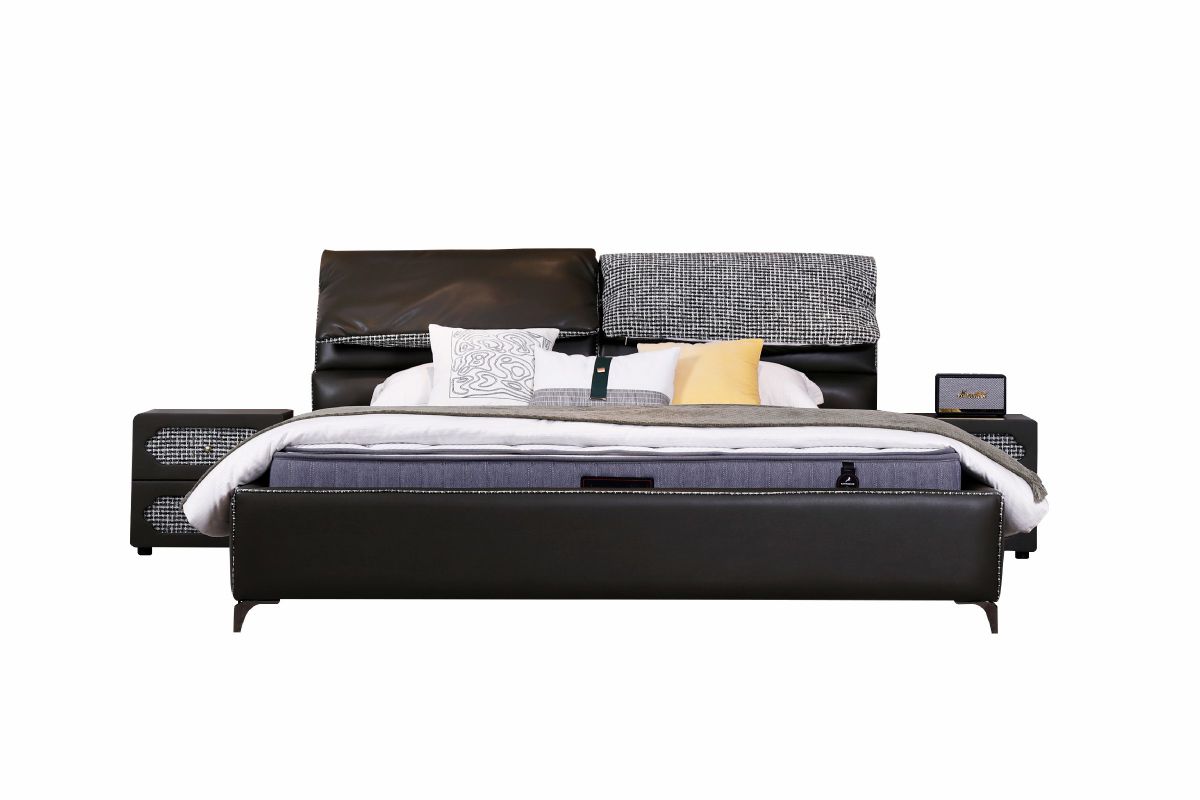 AB面两用,雪尼尔面料+生态皮,床头和床边,实木+实木多层板,床背靠包海绵填充,床侧PU皮,高回弹定型环保海绵