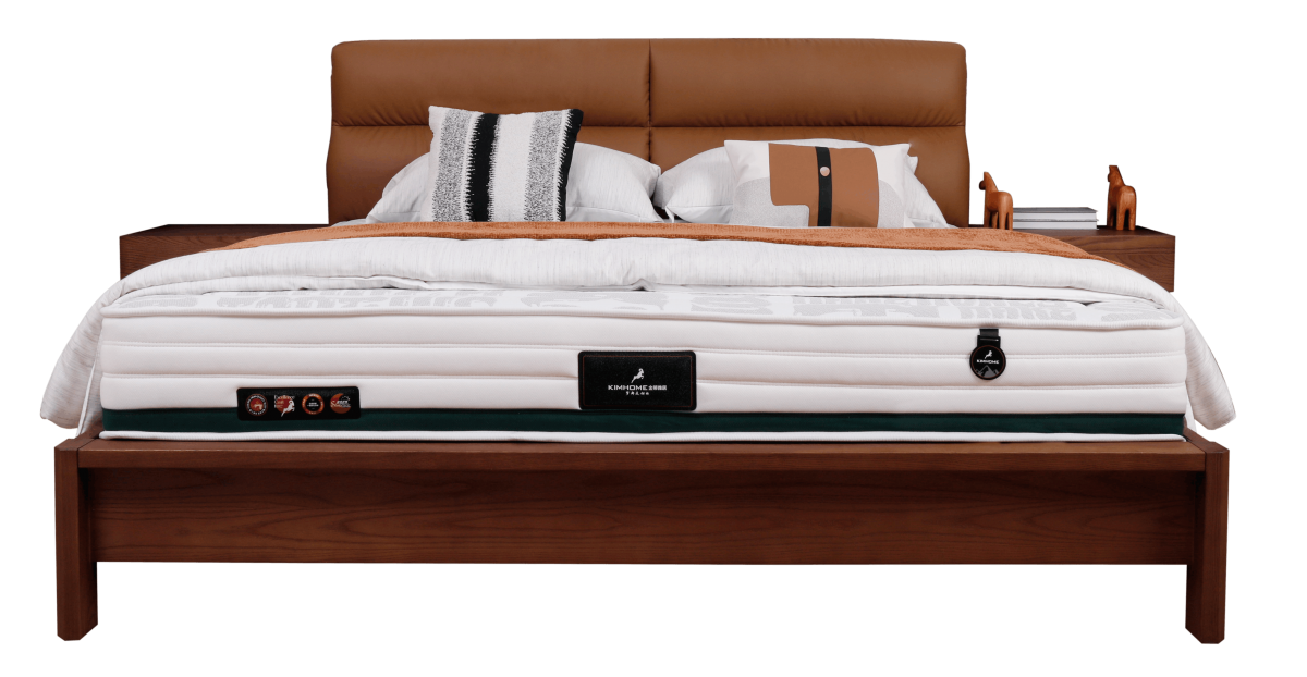 接触面头层牛皮,白蜡木底框架,床背靠包海绵填充, 床侧PU皮,高回弹定型环保海绵